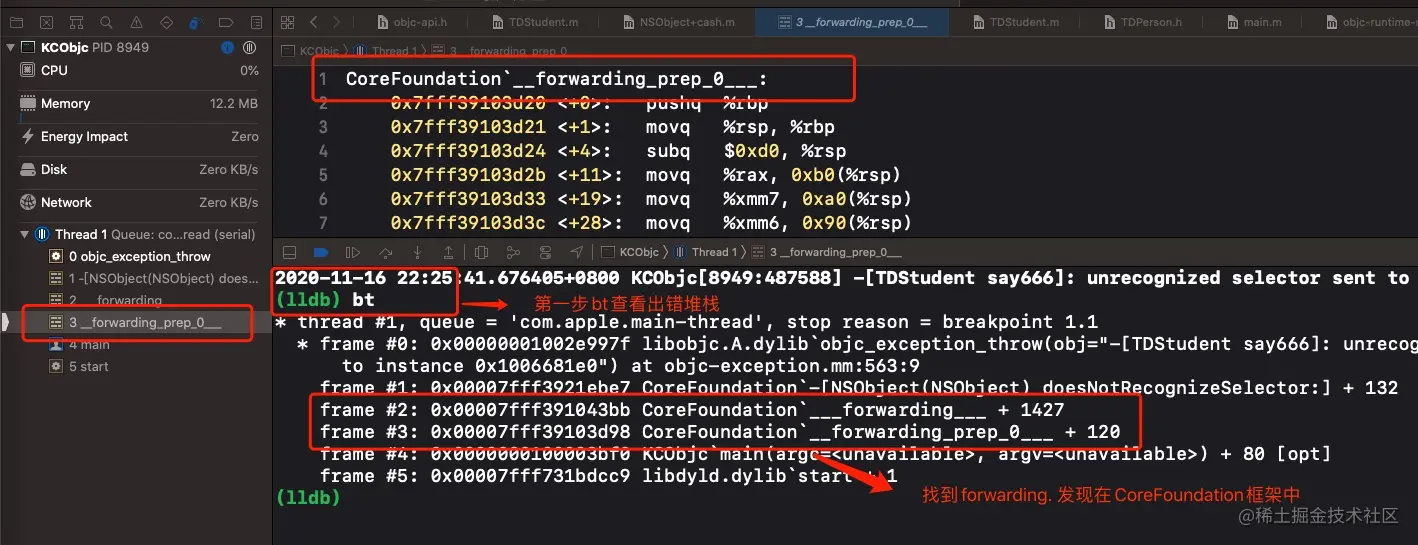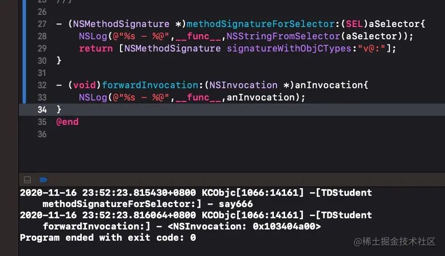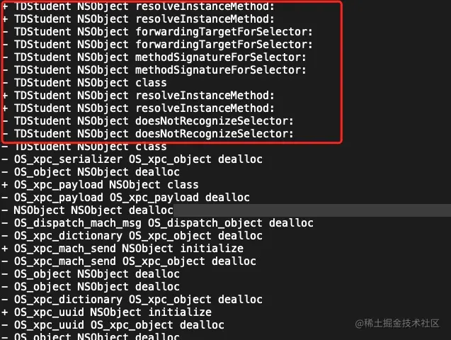 从上面可以得知实例方法和类方法查找路径上都会经过根类,且根类是最后一环,所以我们只要创建一个根类的分类然后重写resolveInstanceMethod方法和resolveClassMethod方法就能做到拦截所有崩溃方法,如下代码实现:// // NSObject+cash.m // KCObjc // // Created by huahua on 2020/11/15. // #import "NSObject+cash.h" #import <objc/runtime.h> @implementation NSObject (cash) +(BOOL)resolveClassMethod:(SEL)sel{ NSLog(@"%@ 来了", NSStringFromSelector(sel)); if (sel == @selector(say888)) { // NSLog(@"%@ 来了", NSStringFromSelector(sel)); //获取sayGoodBye方法的imp IMP imp = class_getMethodImplementation(self, @selector(sayGoodBye)); //获取sayGoodBye的实例方法 Method sayMethod = class_getInstanceMethod(self, @selector(sayGoodBye)); //获取sayGoodBye的方法签名 const char *type = method_getTypeEncoding(sayMethod); //将sel的实现指向sayGoodBye 并加入到方法列表 return class_addMethod(objc_getMetaClass("TDStudent"), sel, imp, type); } return NO; } +(BOOL)resolveInstanceMethod:(SEL)sel{ NSLog(@"%@ 来了", NSStringFromSelector(sel)); if (sel == @selector(say888)) { // NSLog(@"%@ 来了", NSStringFromSelector(sel)); //获取sayGoodBye方法的imp //因为类方法是元类的实例方法所以这里要传入元类 IMP imp = class_getMethodImplementation(objc_getMetaClass("TDStudent"), @selector(sayhai)); //获取sayGoodBye的实例方法 Method sayMethod = class_getInstanceMethod(objc_getMetaClass("TDStudent"), @selector(sayhai)); //获取sayGoodBye的方法签名 const char *type = method_getTypeEncoding(sayMethod); //将sel的实现指向sayGoodBye 并加入到方法列表 return class_addMethod(objc_getMetaClass("TDStudent"), sel, imp, type); }else if(sel == @selector(say666)){ IMP imp = class_getMethodImplementation(self, @selector(sayGoodBye)); //获取sayGoodBye的实例方法 Method sayMethod = class_getInstanceMethod(self, @selector(sayGoodBye)); //获取sayGoodBye的方法签名 const char *type = method_getTypeEncoding(sayMethod); //将sel的实现指向sayGoodBye 并加入到方法列表 return class_addMethod(self, sel, imp, type); } return NO; } @end