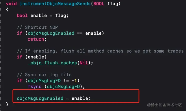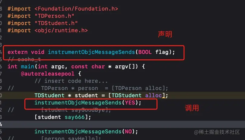 instrumentObjcMessageSends方法中赋值的,所以在main函数中调用一下instrumentObjcMessageSends方法,将objcMsgLogEnabled赋值成true(这里注意需要先声明instrumentObjcMessageSends方法)如下代码:,再去