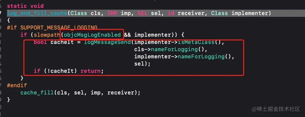 log_and_fill_cache方法就是一个方法缓存和判断是否需要打印日志的一个方法,在打印日志的条件objcMsgLogEnabled && implementerimplementer是传入的类(类或者元类)所以只要objcMsgLogEnabled为true就能打印日志,再看objcMsgLogEnabled发现是在