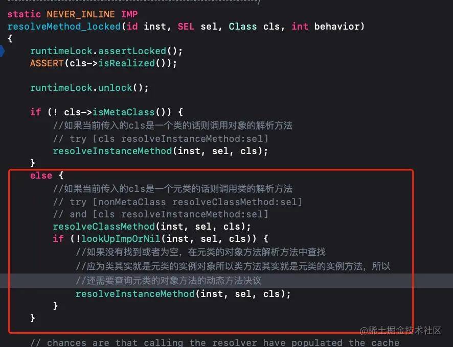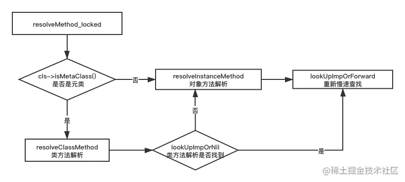 static NEVER_INLINE IMP resolveMethod_locked(id inst, SEL sel, Class cls, int behavior) { runtimeLock.assertLocked(); ASSERT(cls->isRealized()); runtimeLock.unlock(); if (! cls->isMetaClass()) { //如果当前传入的cls是一个类的话则调用对象的解析方法 // try [cls resolveInstanceMethod:sel] resolveInstanceMethod(inst, sel, cls); } else { //如果当前传入的cls是一个元类的话则调用类的解析方法 // try [nonMetaClass resolveClassMethod:sel] // and [cls resolveInstanceMethod:sel] resolveClassMethod(inst, sel, cls); if (!lookUpImpOrNil(inst, sel, cls)) { //如果没有找到或者为空,在元类的对象方法解析方法中查找 //应为类其实就是元类的实例对象所以类方法其实就是元类的实例方法,所以 //还需要查询元类的对象方法的动态方法决议 resolveInstanceMethod(inst, sel, cls); } } // chances are that calling the resolver have populated the cache // so attempt using it //再次慢速查找一次方法 return lookUpImpOrForward(inst, sel, cls, behavior | LOOKUP_CACHE); }- 流程分析