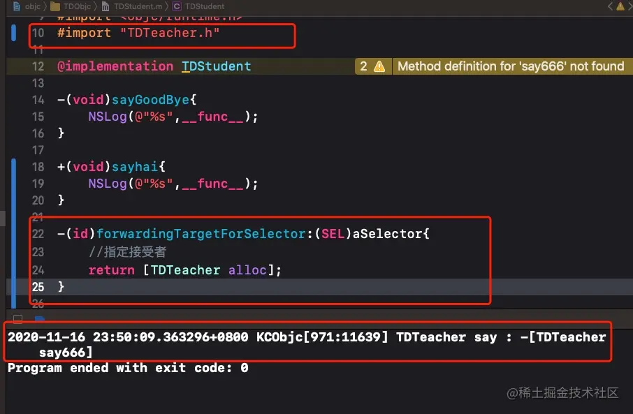 forwardingTargetForSelector方法并返回对应的消息接受者(消息接受者中要有同名方法的实现)如下代码: