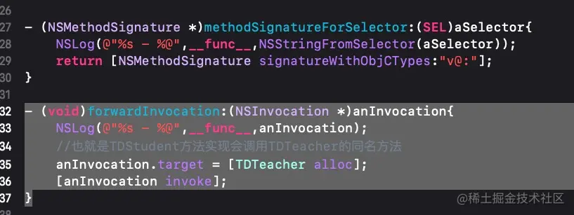 methodSignatureForSelector返回方法签名,然后再实现forwardInvocation方法也可以处理invocation,修改target然后触发事务