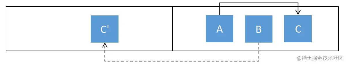 做法就是把Reference链表遍历一遍,看一下每个Reference的 referent 对象是否存活,也就是是否被forward到了新的survivor中去。我们之前介绍copy gc的时候,已经说过了,一个被forward过的对象,它的markOop会指向新的地址,也就是说,上图中,C' 的 forwarding 指针是指向 C 的,我们通过这个指针把 B 再指向C就行了。当然,别忘了,这时的B已经不需要被处理了,所以应该把B从链表中删除了。经过这样的处理以后,在新的空间里,就变成这样了: