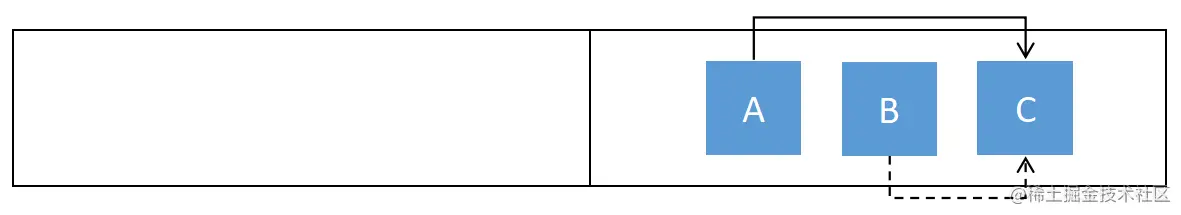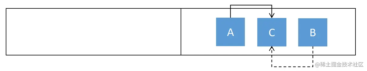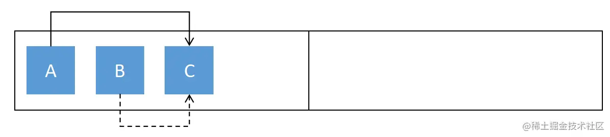 那如果说,B先扫描怎么办呢?B看到C并没有在新的survivor space中,这时候,JVM还是先把B放到链表里,并且把B搬到survivor中(注意B一直是存活的),并且保持C不动。然后当扫描到A,仍然当做普通的引用进行处理,A和C都会被搬到新的空间里。但是,这样一来,当GC结束的时候,B所指的对象是不对的了。如下图所示: