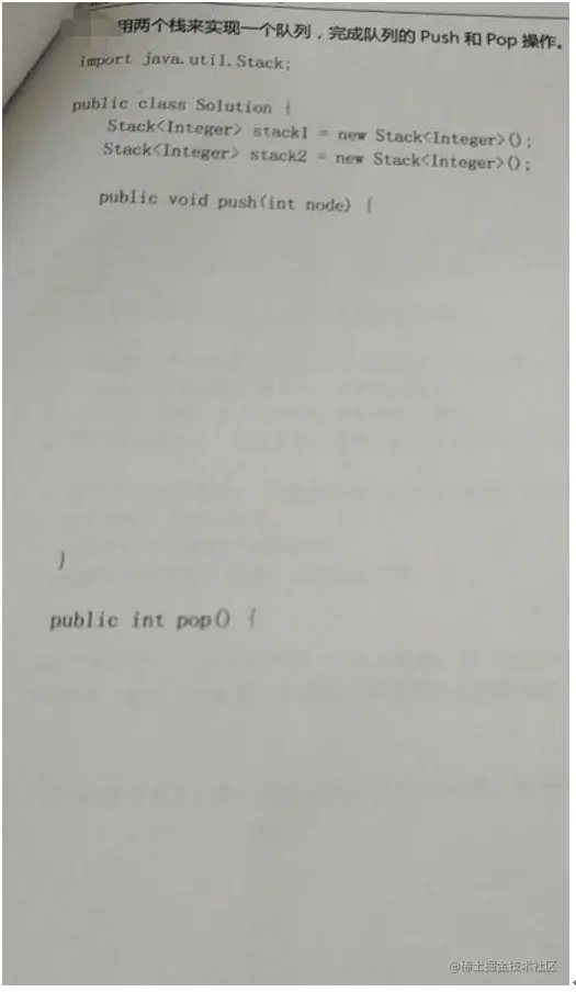 - @return */ public int pop() { //将stack1取出放到,stack2 while (!stack1.empty()) { Integer pop = stack1.pop(); stack2.push(pop); } //取出stack2最上面元素 int resInt = stack2.pop(); //再将stack2剩余元素放到stack1 while (!stack2.empty()) { Integer pop2 = stack2.pop(); stack1.push(pop2); } return resInt; } }