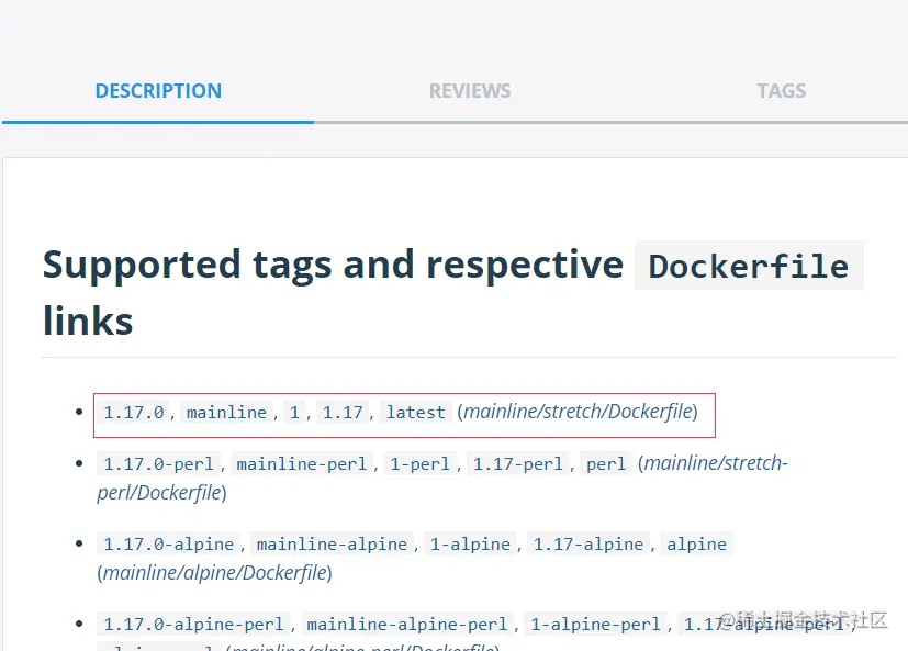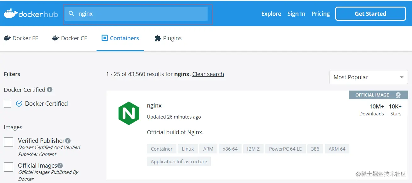 docker search命令只能查找出是否有该镜像,不能找到该镜像支持的版本,所以我们需要通过Docker Hub来搜索支持的版本。