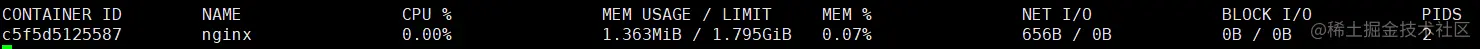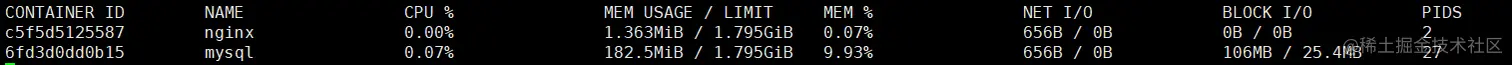 - 查看指定容器资源占用状况,比如cpu、内存、网络、io状态: