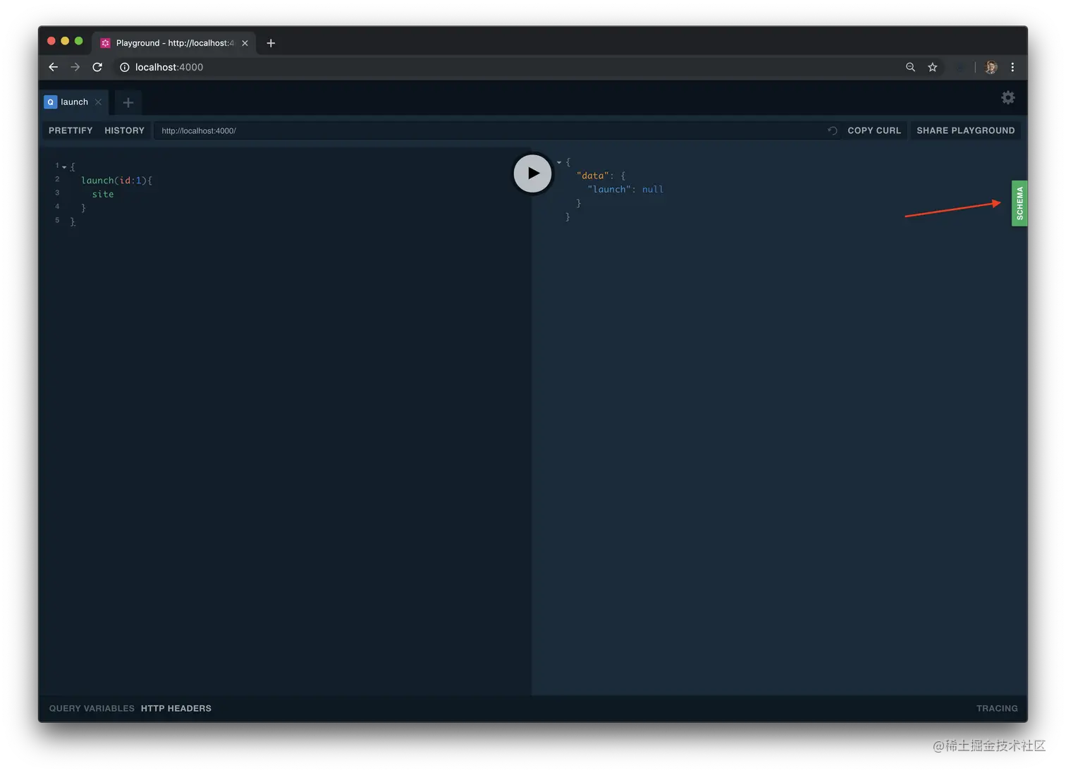 在服务运行时,在浏览器中访问 localhost:4000 以打开 GraphQL Playground。要自检服务器的 schema,请单击右侧的 Schema 按钮: