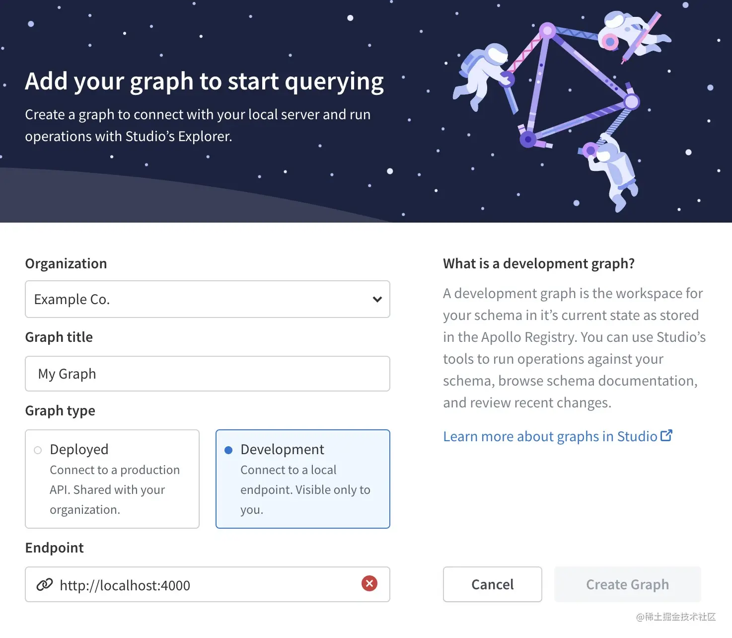 如果想将 Explorer 与本地运行的服务一起使用,可以在 Apollo Studio 中创建 dev graph,如下所示: