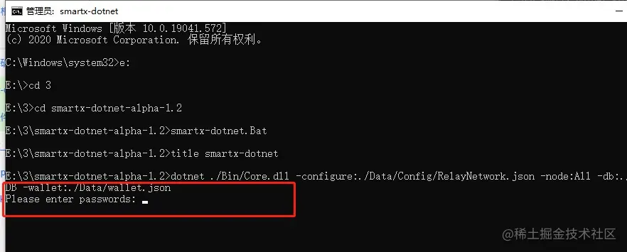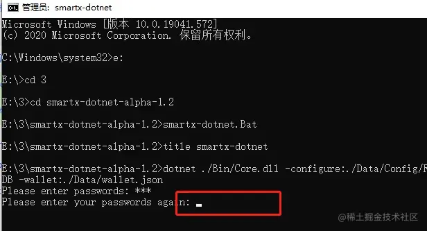 3、右键以管理员身份运行smartx-dotnet.Bat ,按要求设置钱包密码(要牢记),并再一次输入确认密码。