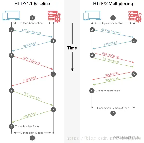 而 HTTP/2 引入二进制数据帧和流的概念,其中帧对数据进行顺序标识,这样浏览器收到数据之后,就可以按照序列对数据进行合并,而不会出现合并后数据错乱的情况。同样是因为有了序列,服务器就可以并行的传输数据。