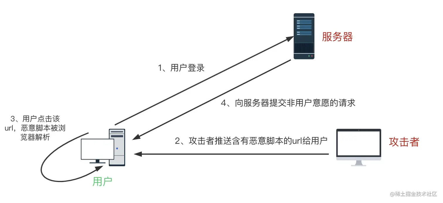 3、用户浏览器收到响应后解析执行混入其中的恶意代码,恶意代码窃取用户数据并发送到攻击者的网站,或者冒充用户行为,调用目标网站接口执行攻击者指定的操作。