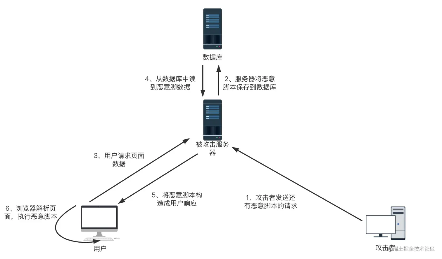 - 持久型,将恶意代码内容发给服务器,服务器没过滤就存储到数据库中了,下次再请求这个页面时就会从数据库中读取出恶意代码拼接到页面HTML上