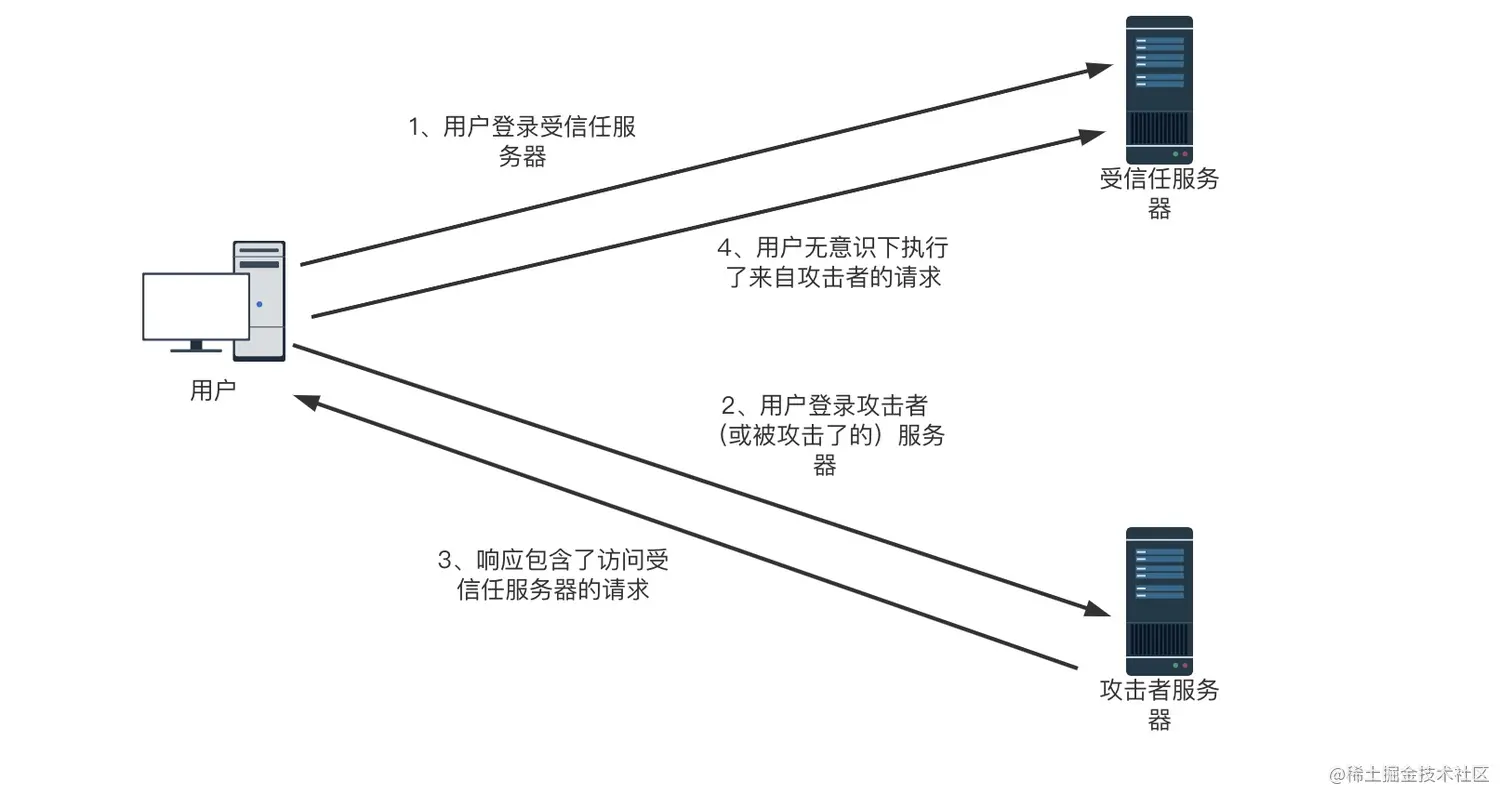 攻击者会诱导受害者访问第三方网站,利用受害者获得的被攻击网站的凭证来冒充正常用户对被攻击网站进行某些操作的目的。