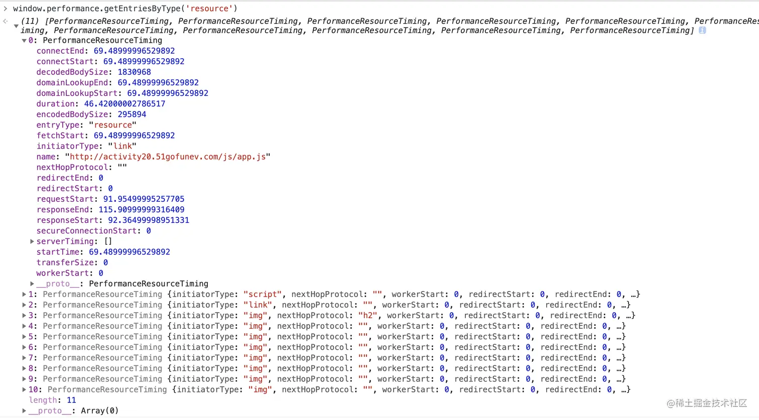 //该方法以数组形式会返回页面当前所加载的所有资源列表。如下图: