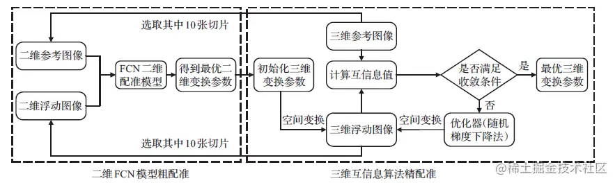 文章采用FCN和互信息的混合优化算法实现三维图像配准任务。利用FCN获得的配准结果作为互信息搜索算法的起始点,通过进一步搜索优化得到更高精度的配准参数,整个配准流程如下图所示。