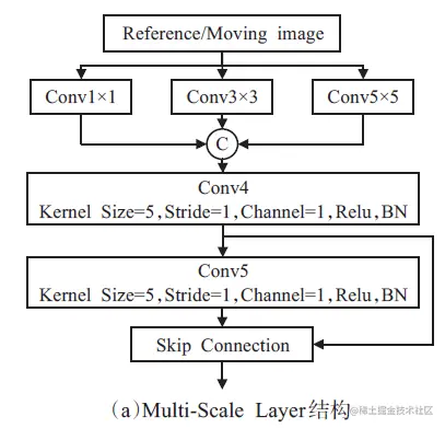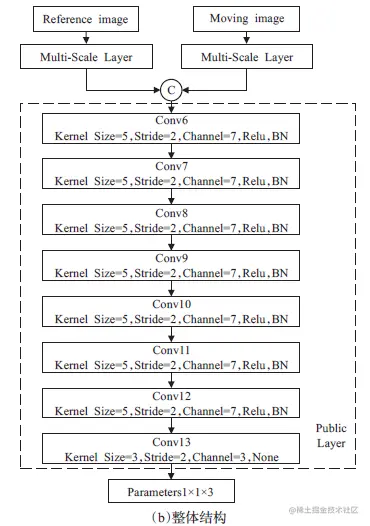整个模型由两部分组成,即参考图像和浮动图像各自的多尺度特征提取器Multi-Scale Layer(下图的a部分),以及通过Concatenate 级联合并(图中为字母C表示)后的公共特征提取器Public Layer。
