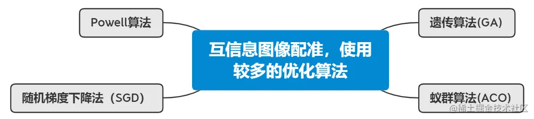 互信息是最常见的基于灰度配准方法之一。在互信息图像配准中,使用较多的优化算法如下图所示。