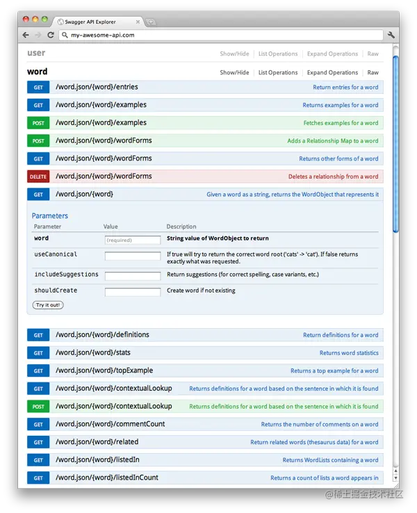 看上图是不是一目了然,最重要的是搜索框可以搜索相关api接口快速查询,并且可以在线调试接口,再来张图展示!