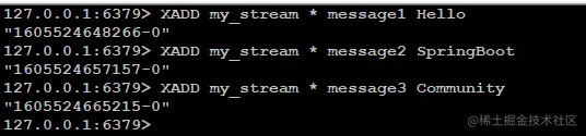 XADD my_stream * message3 Community