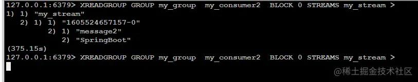 4,再新启动一个Redis客户端(我们称之为:消费端2),使用消费组进行阻塞消费,指定消费者:my_consumer2