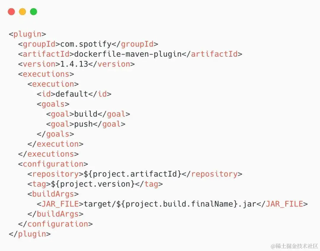 然后,需要在 pom.xml 中添加一些配置,以便指定仓库、tag 标签,还有上面 Dockerfile 中定义的 JAR_FILE。