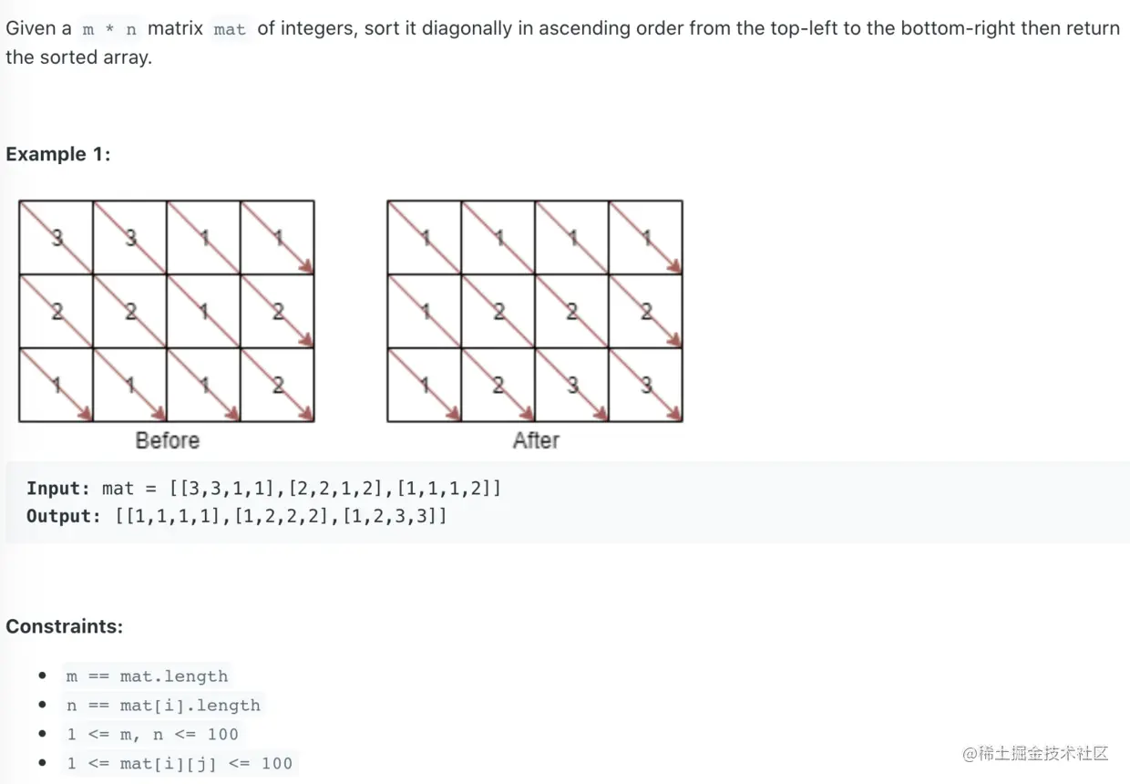 方法: 首先理解题意,本质还是排序,只是index的遍历比一维数组和二维数组特殊是沿着斜线,所以只要特殊处理index的遍历即可,然后再斜轴上进行快排。下面的算法还可以优化空间复杂度,不用分配空间。