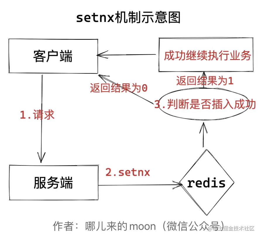 - 首先客户端先请求服务端,服务端将能代表这次请求业务的唯一字段以 SETNX 的方式存入redis,并设置超时时间,超时时间可以根据业务权衡。