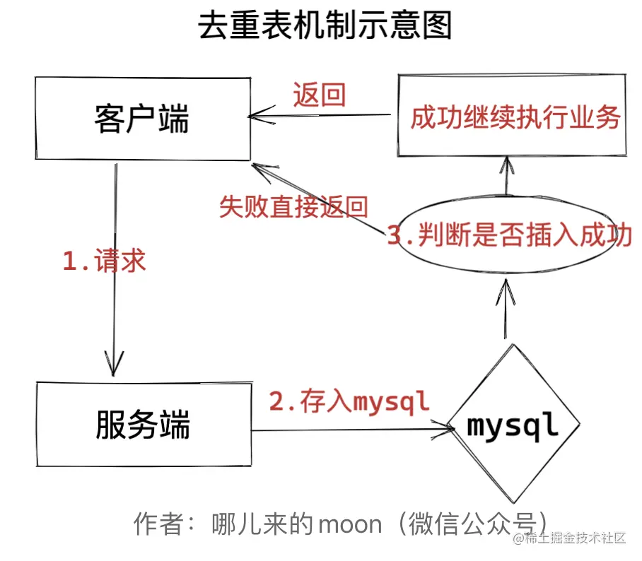 - 首先客户端先请求服务端,服务端先将这次的请求信息存入一张mysql的去重表中,这张表要根据这次请求的其中某个特殊字段建立唯一索引,或者主键索引。