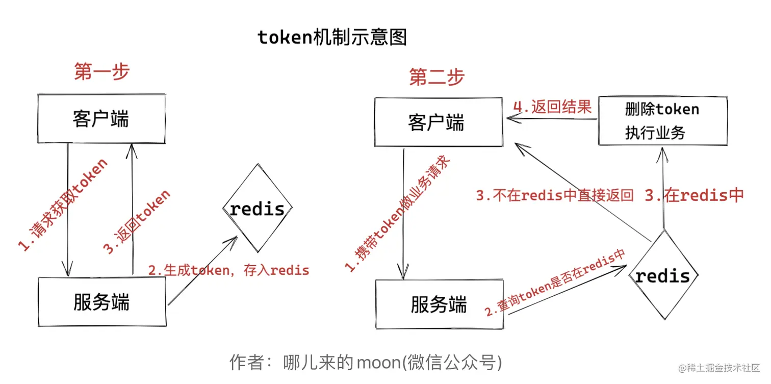 - 首先客户端先请求服务端,服务端生成token,每次请求生成的都是一个新的token(这个token一定要设置超时时间),将token存入redis当中,然后将token返回给客户端。