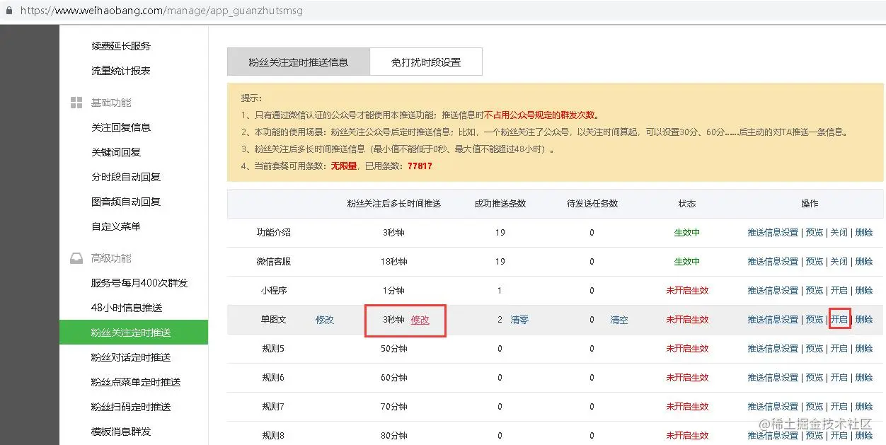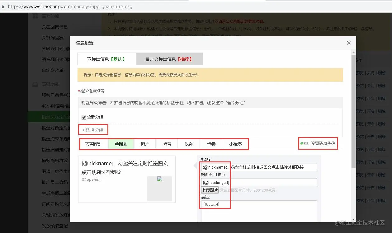 使用公众号后台被关注回复功能,只能设置关注公众号后回复一条图文消息,如果想要设置回复多条图文消息,可以自己根据公众号后台的接口开发实现,或者直接用第三方平台微号帮功能粉丝关注定时推送,支持公众号设置关注回复多条图文消息,还可以按粉丝标签分组定向推送,也可以设置关注回复消息的昵称和头像,设置免打扰时段(1天24个小时段),即已设置时段关注后不会定时回复消息。支持关注定时0秒到48小时之间,定时0秒即关注后立即推送消息。