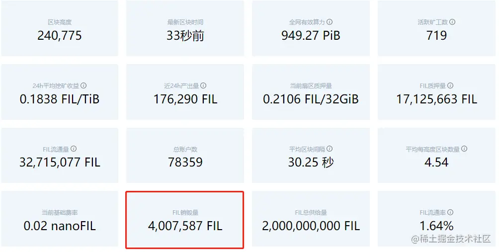 在[**Filecoin**](http://ipfs.cn)区块链浏览器上,我们不仅可以看到Filecoin全网区块高度、24小时产出、全网有效算力等,细心的朋友们会发现,还有一个类目叫做FIL销毁量,根据区块链浏览器显示,目前FIL已经销毁4007587枚。