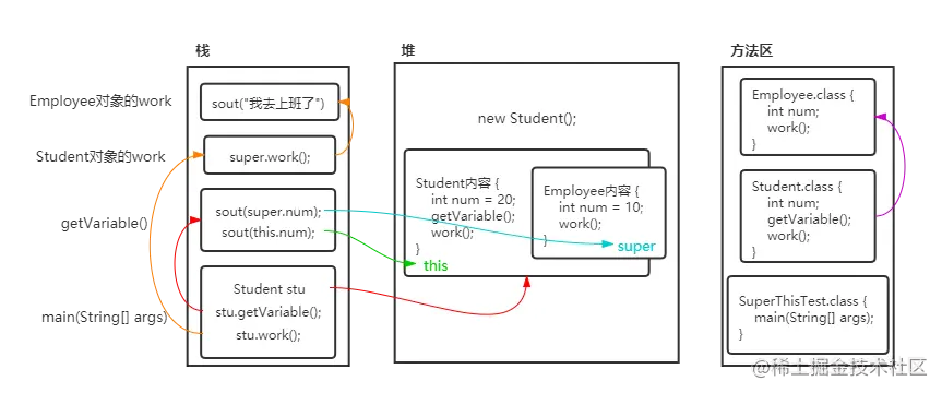 stu.getVariable();语句,将getVariable()方法压栈,执行方法中的内容,通过super.num找到Employee内容中的num,然后通过this.num找到Student内容中的num,getVariable()执行完毕,出栈。