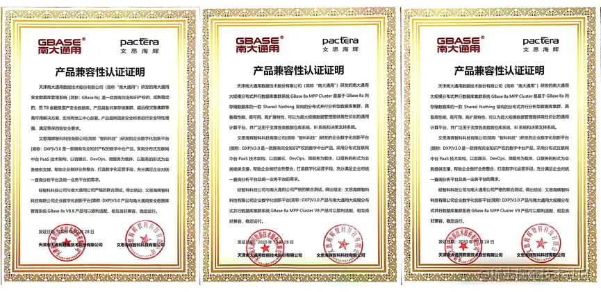 近日,文思海辉与天津南大通用数据技术股份有限公司(以下简称:南大通用)完成产品兼容性互认证。经双方联合测试得出:文思海辉智翼云企业数字化创新平台产品SuperDXP与南大通用安全数据管理系统GBase 8s、大规模分布式并行数据库集群系统GBase 8a MPP ClusterV8、V9 均良好兼容,系统功能稳定运行且表现优异,能够充分满足企业级用户应用需求。