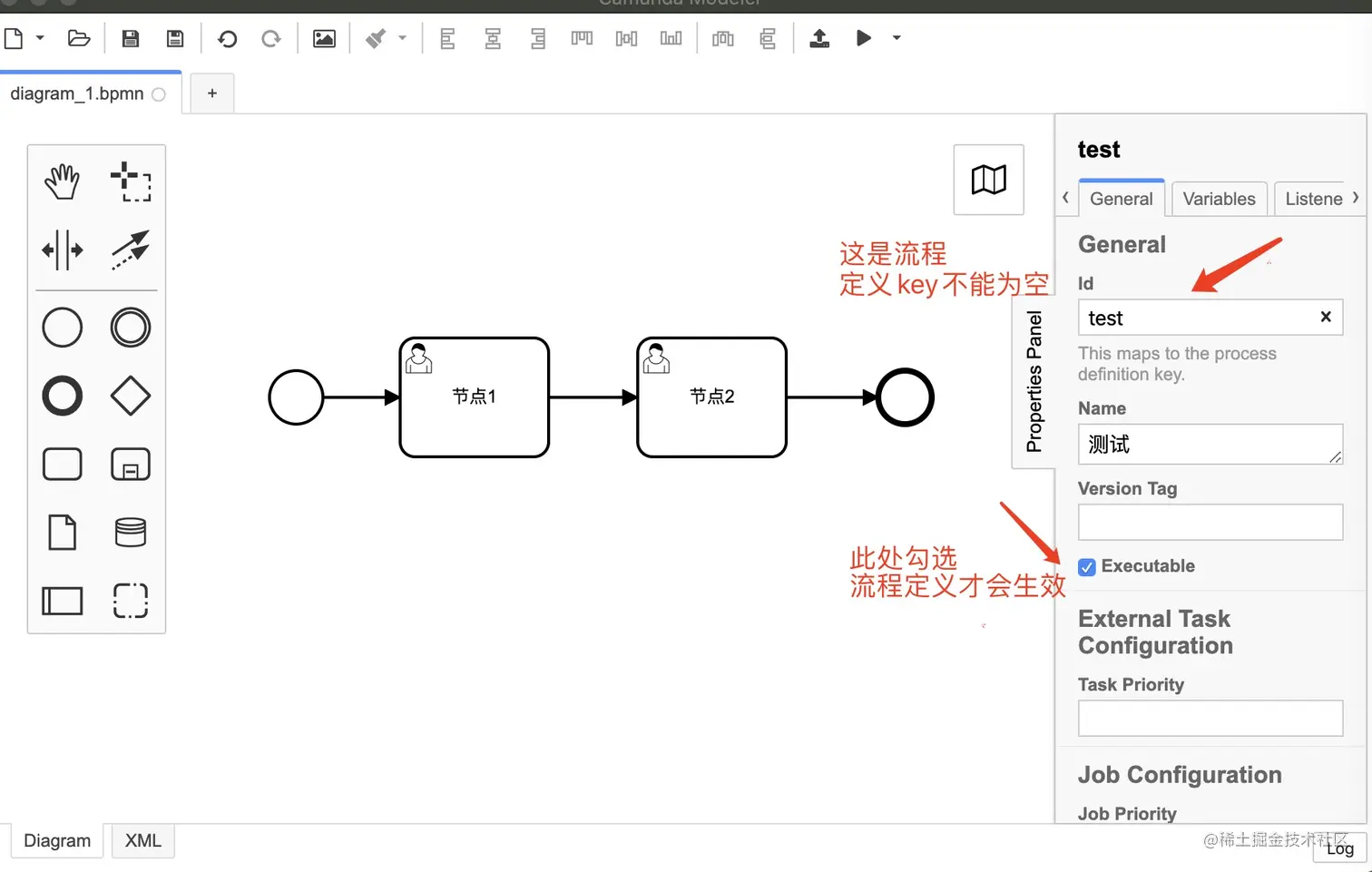 如果在设计流程时Executable是勾选状态,流程部署后,流程定义的信息也同步生成,如果没有勾选,则只会生成部署相关的信息,流程定义的信息是无法获取的,因此我们可以使用api查询流程定义的信息