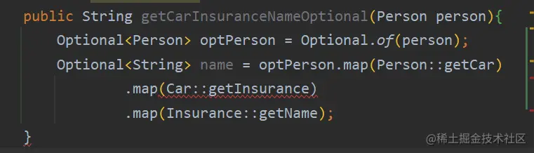 (Optional<Optional<Car>> car = optPerson.map(Person::getCar); ),因此,它对getInsurance的调用是非法的,因为最外层的optional对象包含了另一个optional 对象的值,也就是出现了嵌套式optional 结构。