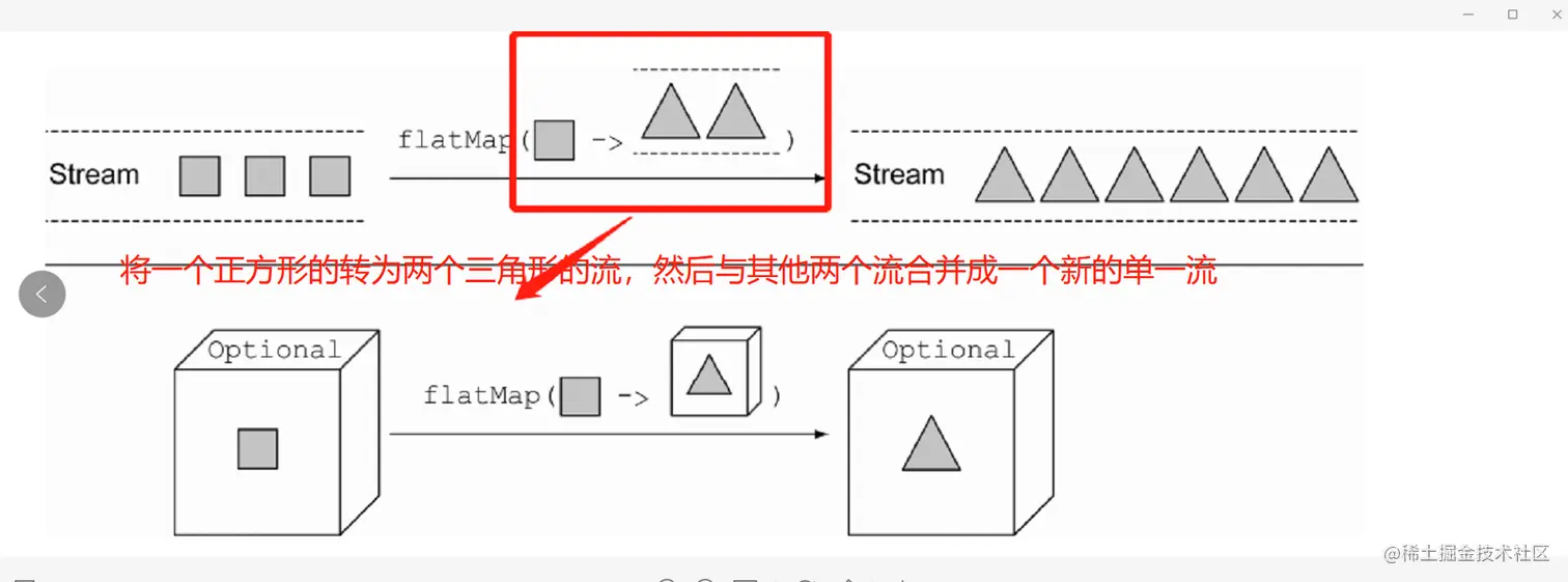 flatMap方法会将这种两层的Optional对象转换为包含三角形的单一Optional对象。所以就要先理解他们的区别。