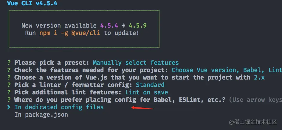 In dedicated config files 选项 将会在项目的根目录下生成 babel eslint 的配置文件, 如果选择的是In package.json 则会将 eslint 的配置 放在 package.json 文件