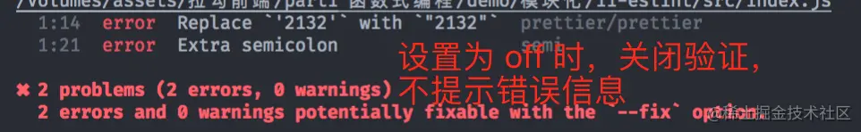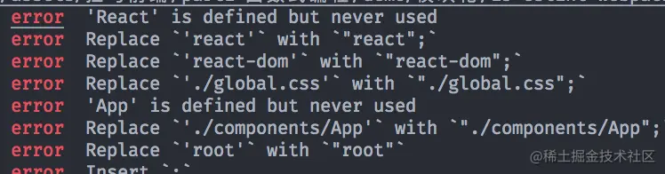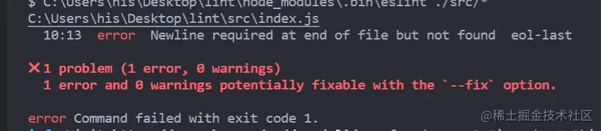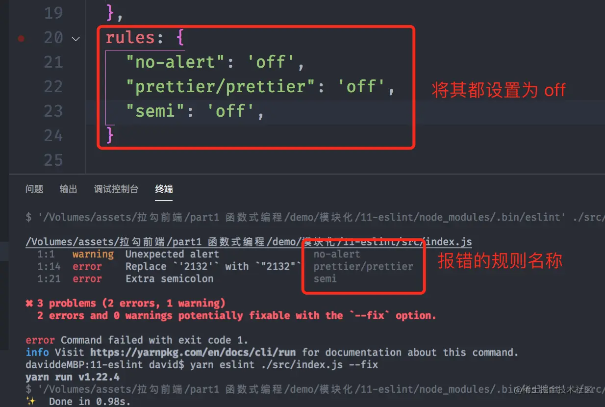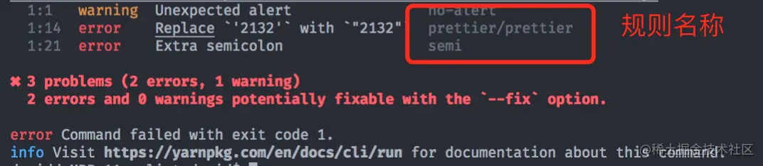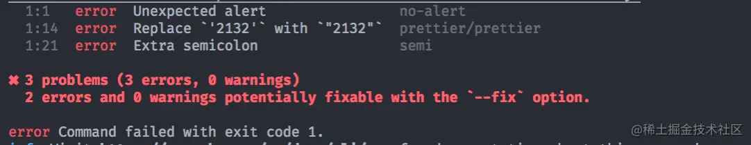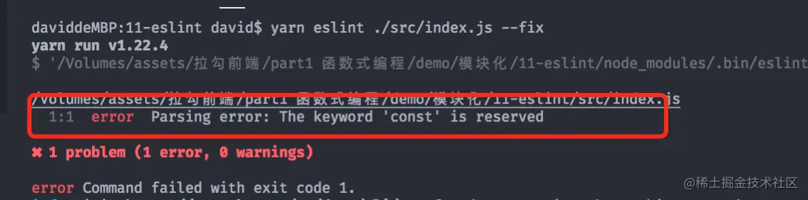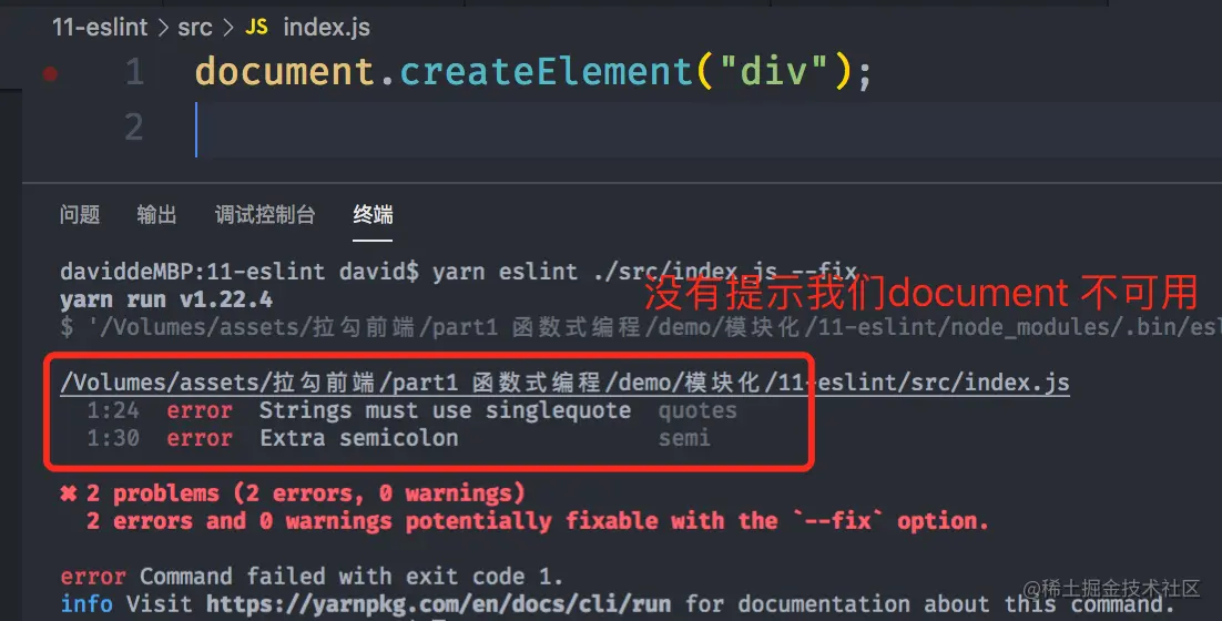 --fix去自动校正代码,解决绝大多数错误。 运行yarn eslint ./src/index.js --fix,其实在eslint 当中,很多提示错误都是一些关于编码规范的错误,比如没有换行、代码间隔的太远....