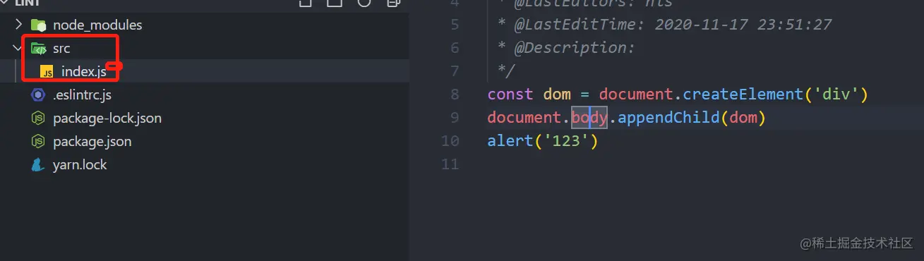 初始化后,在项目的根目录下会生成一个默认的 eslint 配置文件.eslintrc.js,