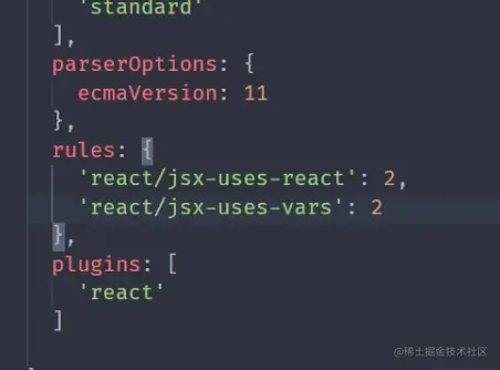 在没有配置之前可以看到 React is defined but never used , 在React 中我们页面必须要引入 React 这是必须的,我们可以在 rules 中配置'react/jsx-uses-react':2 解决