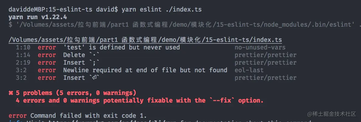 在项目根目录下创建index.ts ,编写 ts 代码,运行yarn eslint ./index.ts. 可以看到正常检查。