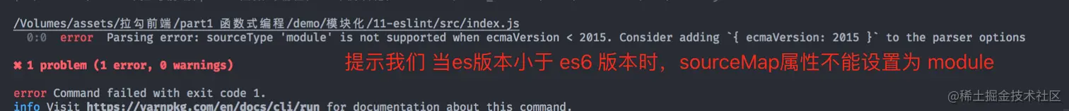 运行命令yarn eslint ./src/index.js 首先这里先提示我们 sourceType 不能配置为 module,因为 module是 es6当中的特性。