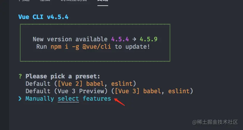 安装 vue-cli 后,使用 vue create eslint-app 创建项目