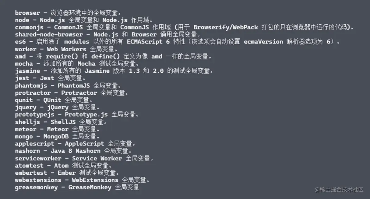 env属性值是一个对象,可配置多个环境,同时存在多个环境。配置环境后在代码中使用环境下的api 在eslint 校验时可正常运行。
