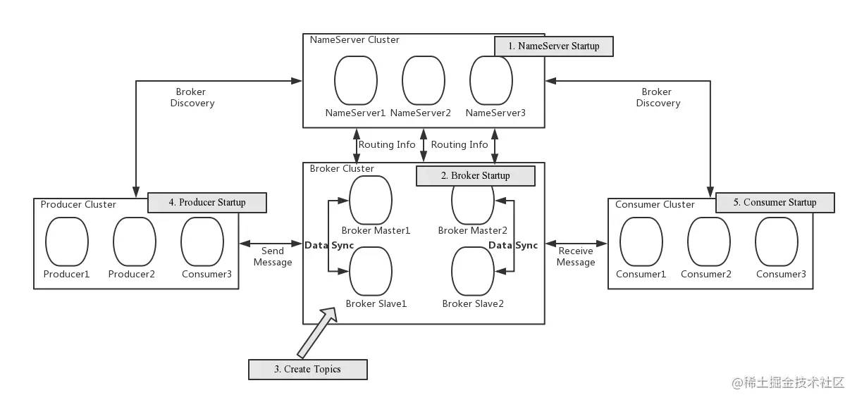 - 启动NameServer,NameServer起来后监听端口,等待Broker、Producer、Consumer连上来,相当于一个路由控制中心。