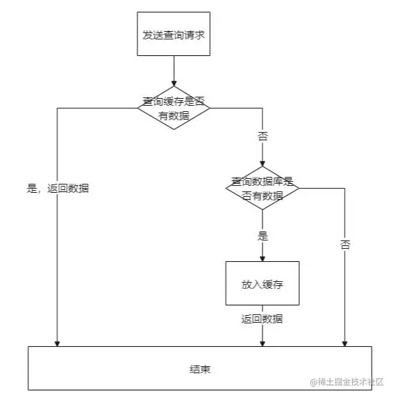 发送请求查询数据,查询规则是先查缓存,如果缓存没有数据再查询数据库,将查到的数据放入缓存最后返回数据给客户端。如果请求的数据是不存在的,最终每次请求都会请求到数据库中,这就是缓存穿透。