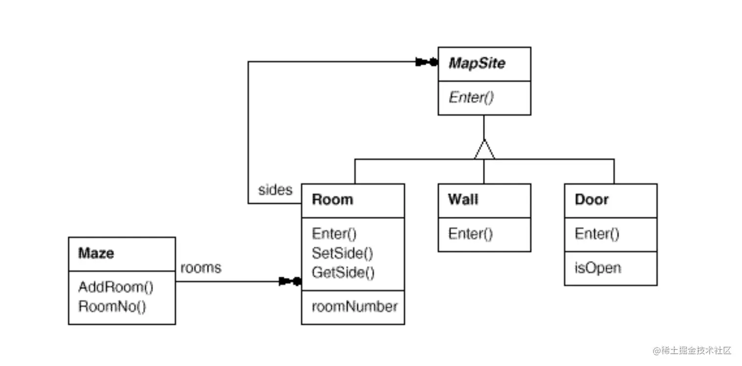MapSite类是所有的迷宫组件的通用抽象类。为了简化例子,MapSite定义了一个操作,进入。它的意思取决于你将进入什么地方。如果你进入房间,就改变你的位置。如果你进入一个门,两件事的其一发生:如果门开着的,你就进入另一个房间;如果门关着的,你就碰壁了。
