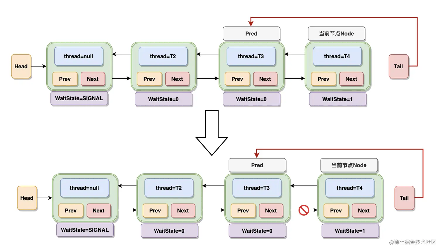 T4 线程所在节点获取锁失败尝试停止时,会执行上述代码,执行后的等待队列如下图所示