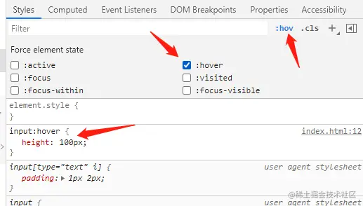 例如我想查看元素触发 hover 时的 css 样式。先选中该元素,然后按下图操作: